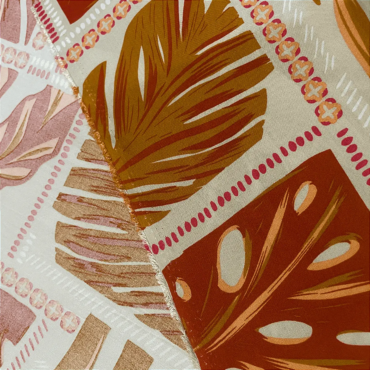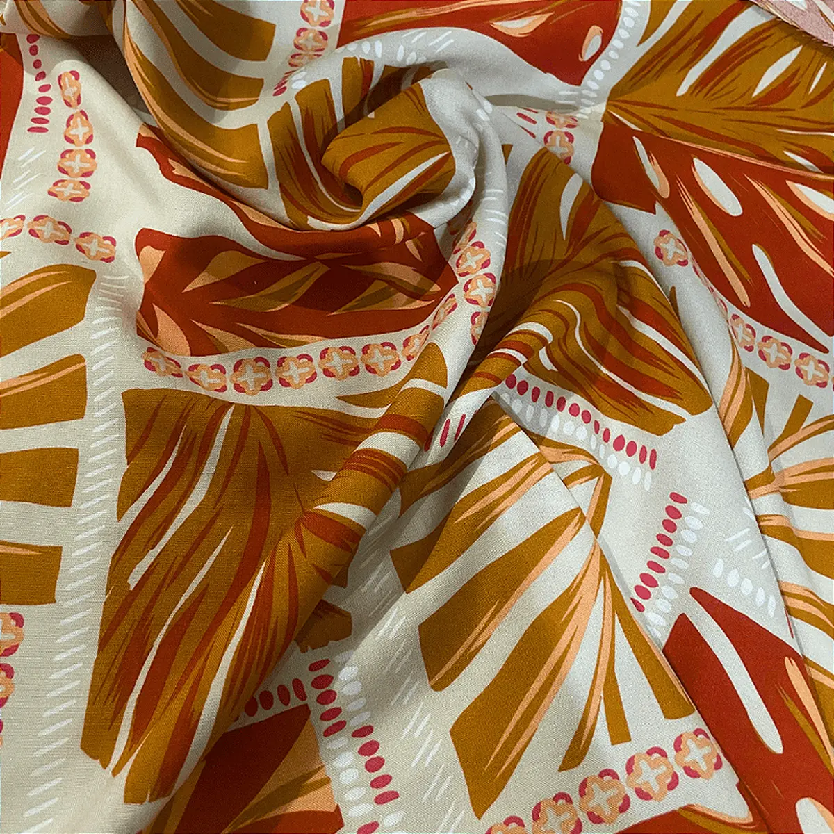 A viscose é a alma da moda casual e versátil. Feita a partir de fibras naturais de celulose, ela combina o melhor de dois mundos: o toque macio e gentil do algodão com um caimento fluido e um balanço que só ela tem. Com sua gramatura leve de 120 g/m², este tecido é incrivelmente respirável, ideal para manter você fresca e confortável mesmo nos dias mais quentes. É a base perfeita para estampas vibrantes que ganham vida com o seu movimento.
