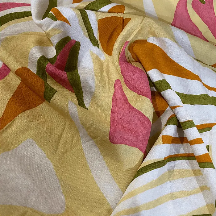 A viscose é a alma da moda casual e versátil. Feita a partir de fibras naturais de celulose, ela combina o melhor de dois mundos: o toque macio e gentil do algodão com um caimento fluido e um balanço que só ela tem. Com sua gramatura leve de 120 g/m², este tecido é incrivelmente respirável, ideal para manter você fresca e confortável mesmo nos dias mais quentes. É a base perfeita para estampas vibrantes que ganham vida com o seu movimento.