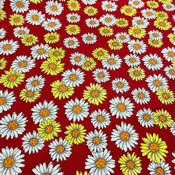 Tricoline Estampado 100% Poliéster - Margaridas Fundo Vermelho - -