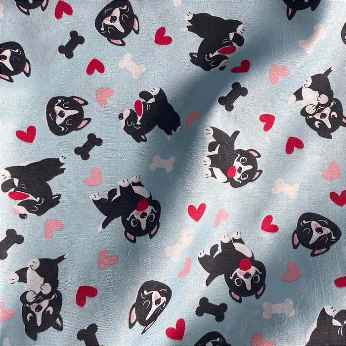 Tricoline Estampado 100% Poliéster - Pet Bulldog Fundo Azul Clar -
