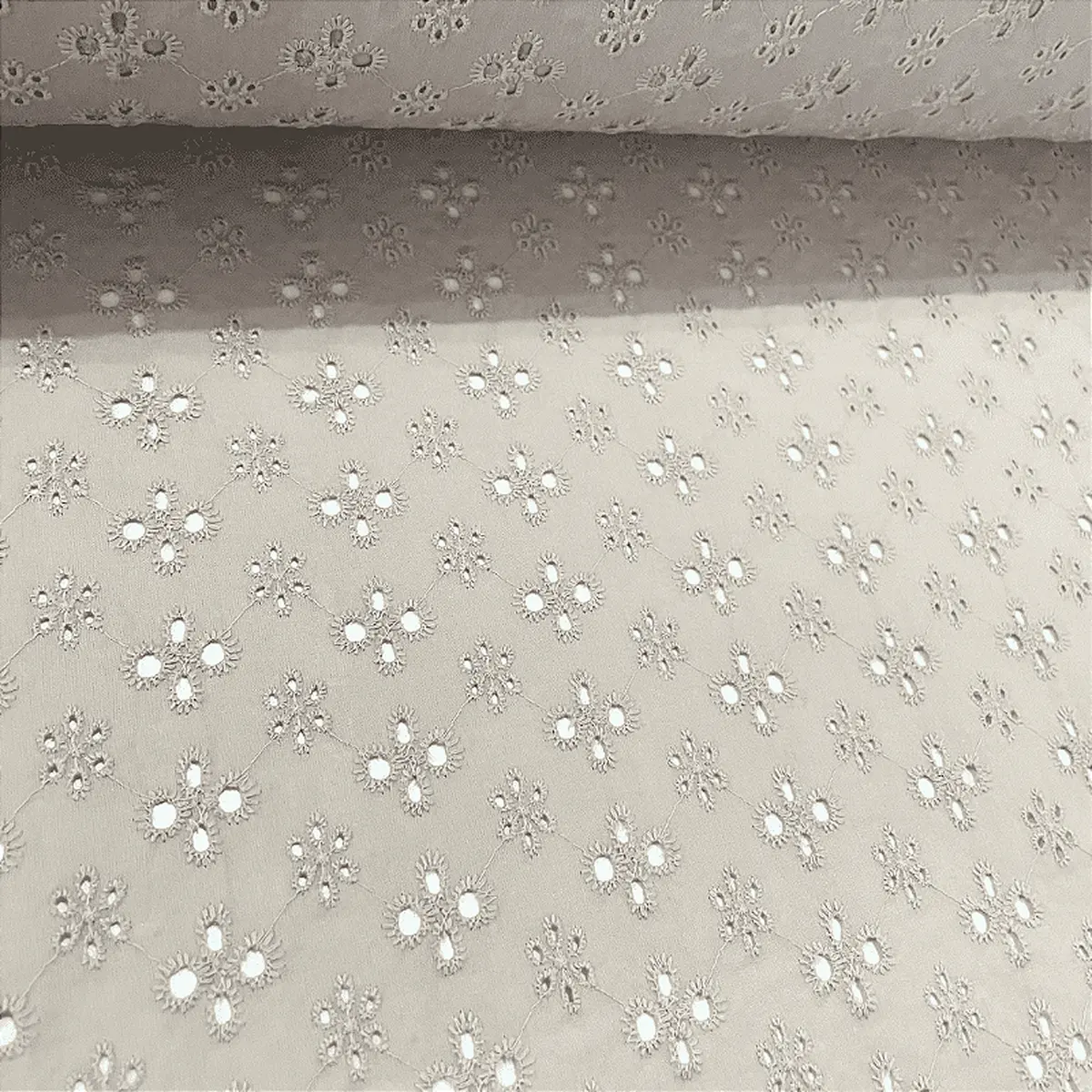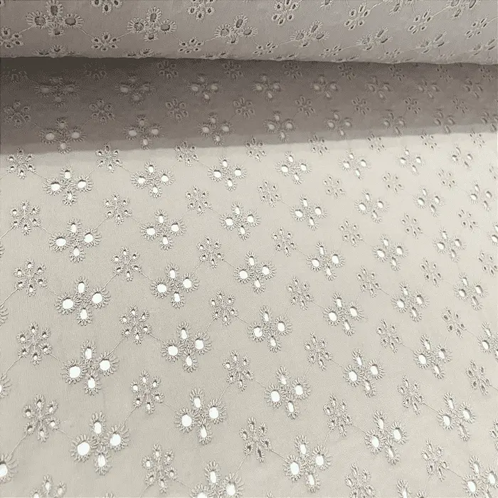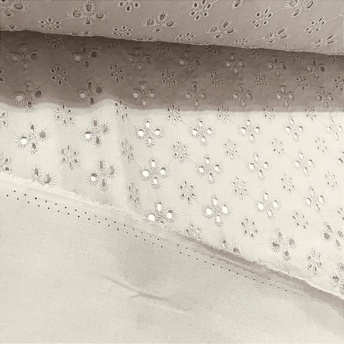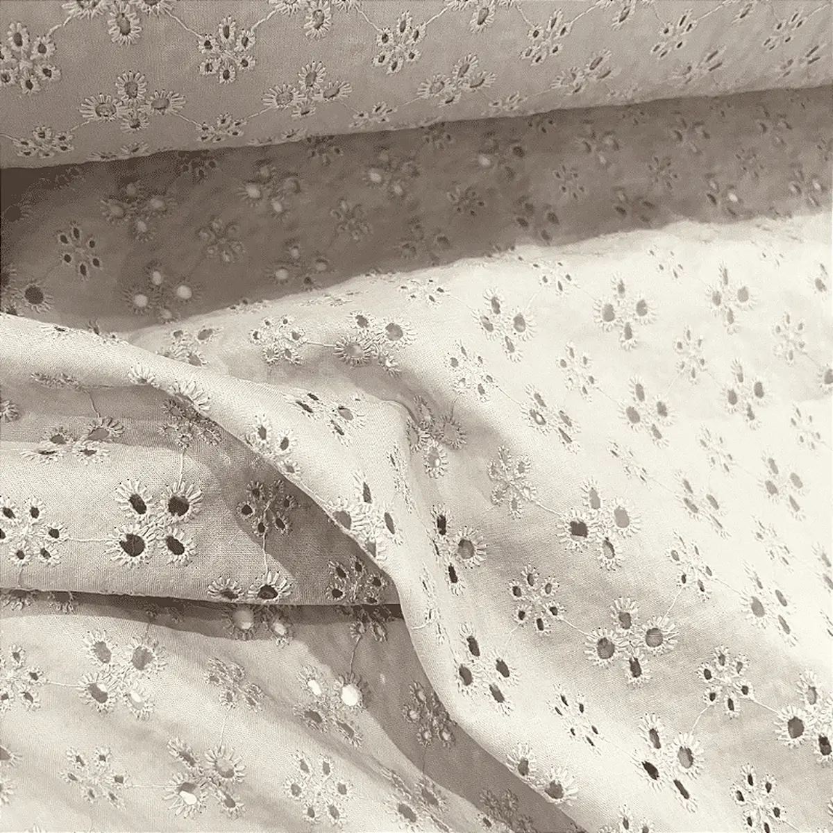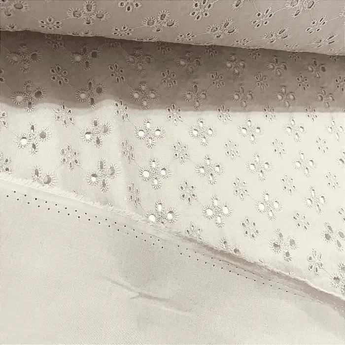 A Laise é um tecido 100% Algodão que possui como traço marcante sua superfície vazada e bordada