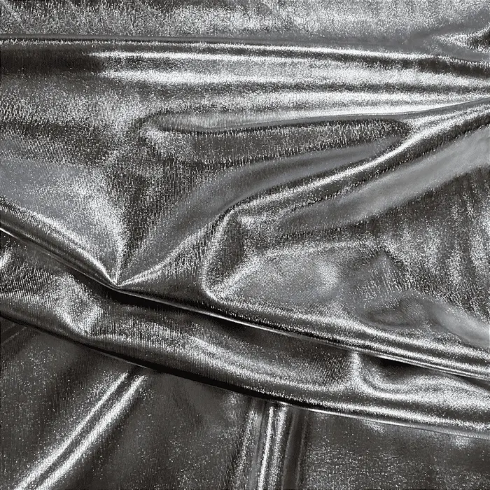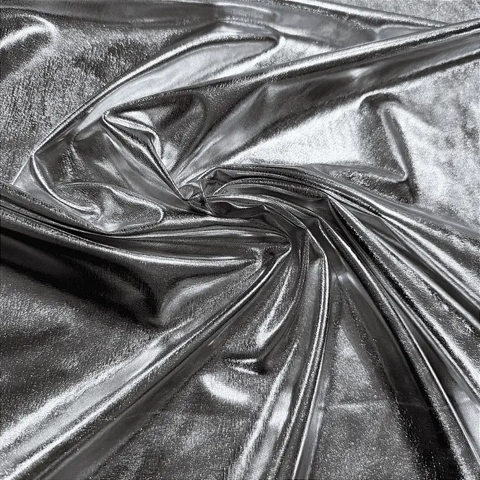 A Malha Metal é a fusão perfeita entre tecnologia e estilo. Sua base é feita de uma malha macia e agradável ao toque, enquanto sua superfície recebe uma camada uniforme de foil (película metalizada) que garante um brilho espelhado e intenso por todo o comprimento. Graças à adição de 4% de Elastano, o tecido possui uma elasticidade excelente, moldando-se às curvas do corpo com conforto, sem apertar ou restringir os movimentos. É a escolha número um para quem quer ser visto e lembrado.