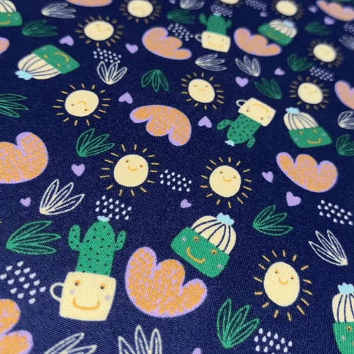 Malha Suede Pijama - Cactus Fundo Azul Marinho - 1,60m de Largur -