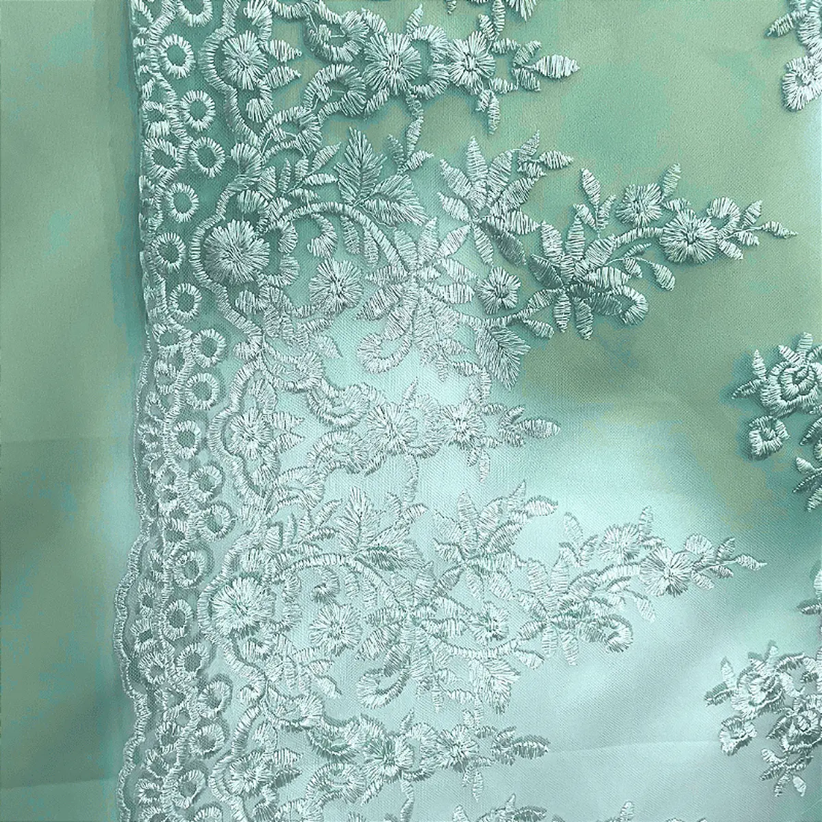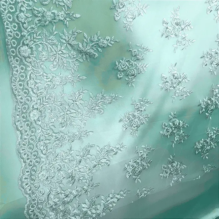 Renda Tule Bordado - Floral Verde Menta - 1,40m de Largura -