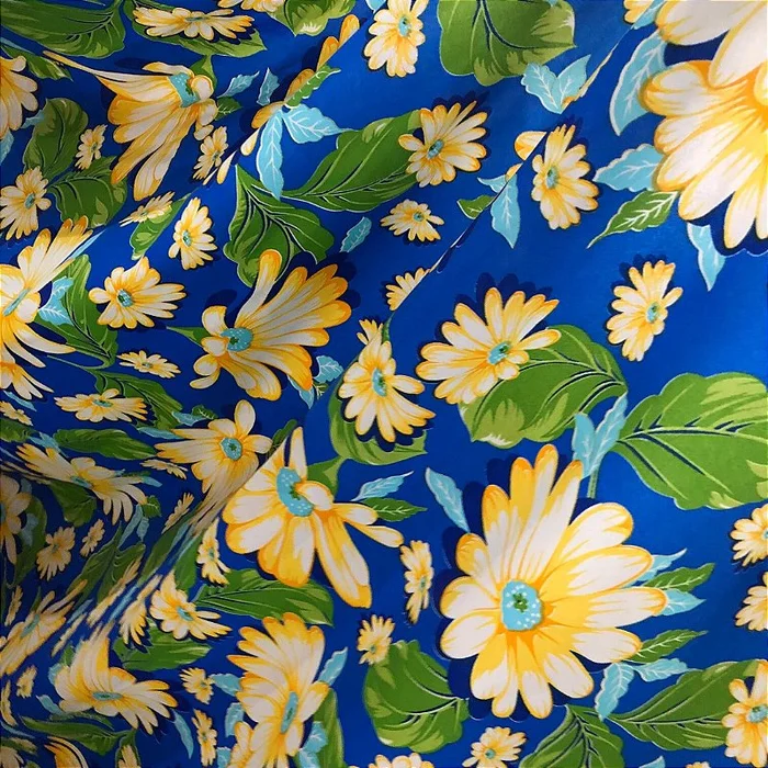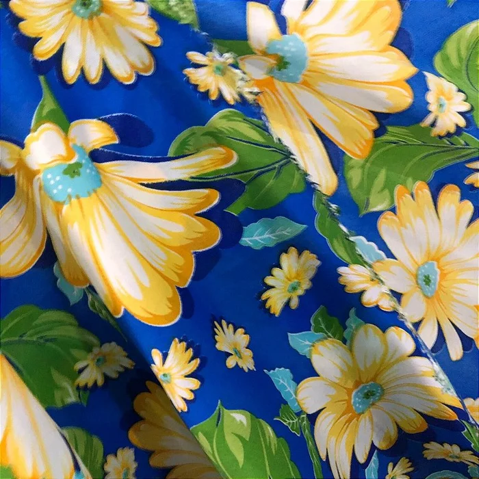 Tecido Chita Poliéster - Floral Amarelo Fundo Azul - 1,50m de La -