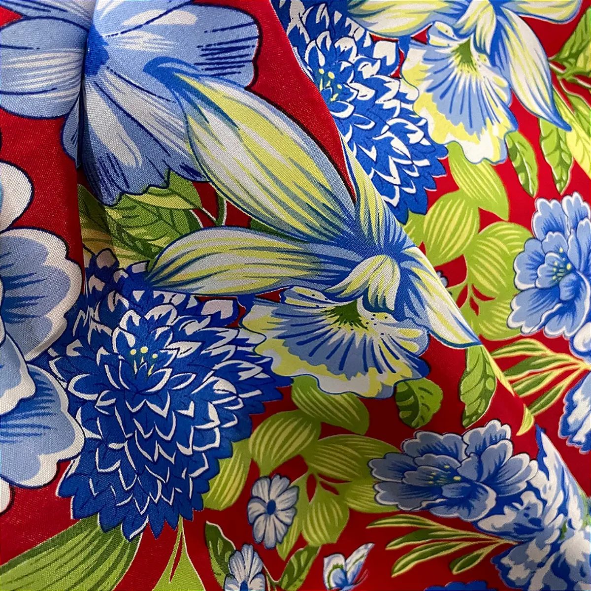 Tecido Chita Poliéster - Floral Azul Fundo Vermelho - 1,50m de -