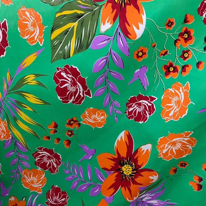 Tecido Chita Poliéster - Floral Laranja Fundo Verde - 1,50m de L -