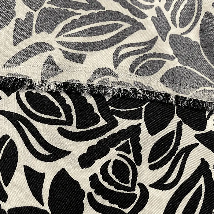 Tecido Crepe Sarjado Estampado - Floral Abstrato Preto e Branco -